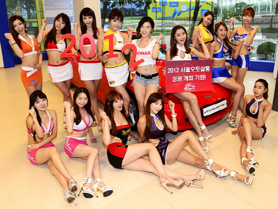 오는 12일 '2012 서울오토살롱'의 개막을 앞두고 5일 오전 서울 쉐보레 삼성점 전시장에서 행사 참여 레이싱 모델들이 서울오토살롱의 성공 개최를 기념하는 퍼포먼스를 진행하고 있다.