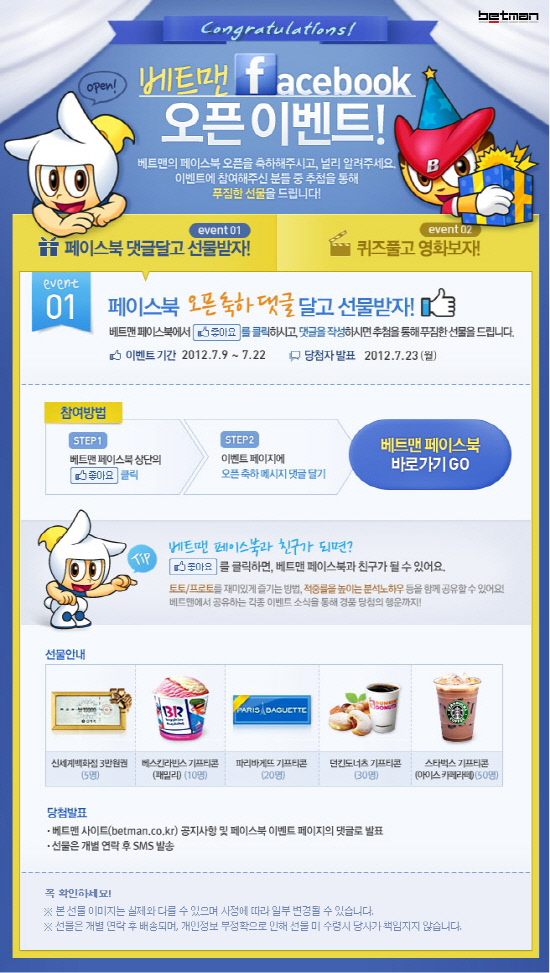 먼저 이벤트 1 '페이스북 댓글달고 선물받자!'에 참여하고자 하는 베트맨 회원들은 베트맨 페이스북 상단의 '좋아요' 버튼을 클릭한 후 이벤트 페이지에 오픈 축하 메시지를 남기면 된다.