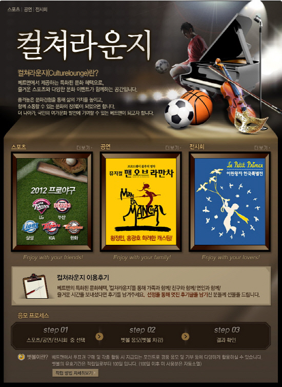 국민체육진흥공단(www.kspo.or.kr)이 발행하는 체육진흥투표권 수탁사업자인 스포츠토토의 공식 온라인 발매 사이트 베트맨(www.betman.co.kr)이 진행하고 있는 베트맨 컬쳐라운지 스포츠 및 전시, 공연 이벤트가 스포츠토토팬들의 뜨거운 관심 속에 성황리에 진행되고 있다.