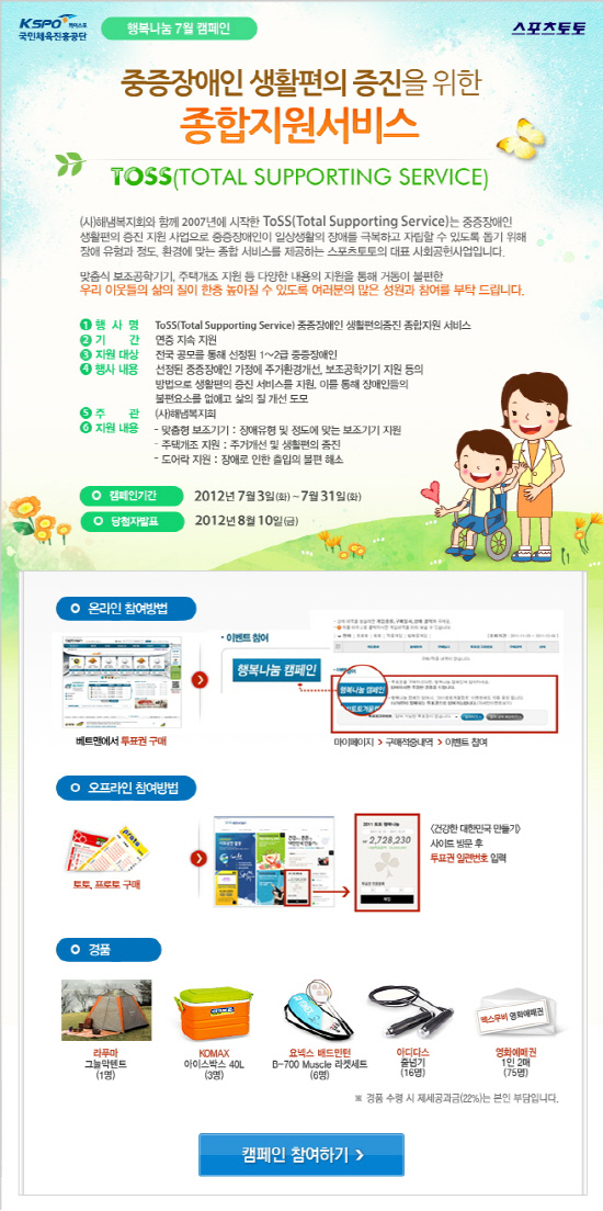 행복나눔 캠페인은 매달 1000만원을 목표로 스포츠토토 팬들의 기부금을 모아 어려운 이웃을 돕는 이벤트로, 7월에 적립된 기부금은 중증장애인 생활편의 증진을 위한 종합지원서비스 'ToSS(Total Supporting Service)' 사업 지원금으로 사용될 예정이다.