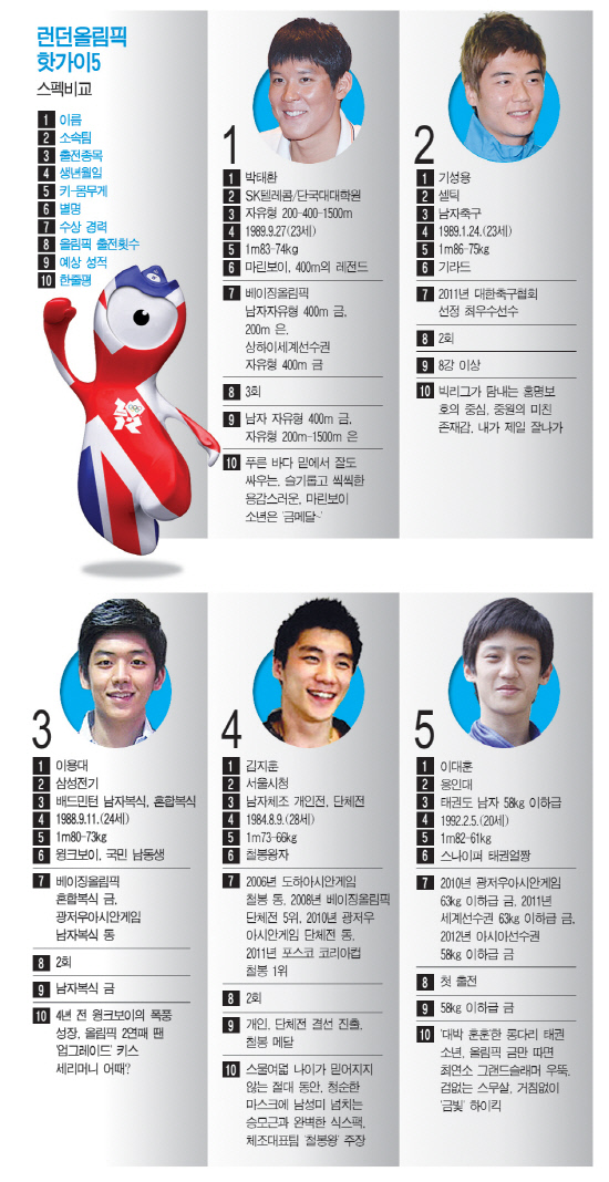 스포츠도 바야흐로 비주얼 시대다. 영화 속 '엑스맨'처럼 비범한 재능에 훈훈한 마스크, 탄탄한 식스팩까지 받쳐준다면 금상첨화다. 런던올림픽에 나서는 뜨거운 '대세남' 5명을 '매의 눈'으로 엄선했다.흐뭇한 '엄마미소'를 부르는, 런던올림픽에서 놓치면 후회할 안구정화 '핫가이5' 열전이다.