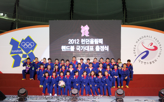 | ◇2012년 런던올림픽에 나서는 남녀 핸드볼 대표팀이 18일 서울 방이동 올림픽공원 SK핸드볼전용경기장에서 열린 출정식에서 선전을 다짐하며 포즈를 취하고 있다. 사진제공=대한핸드볼협회 |