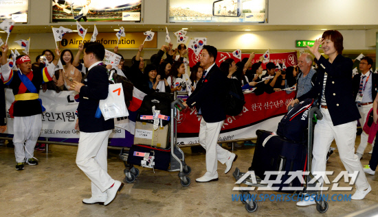 '런던올림픽 선수단 본진이 런던에 입성 했다.' 20일 오후 런던 히드로공항을 통해 대표팀 선수단이 입국 했다. 교민들의 열렬한 환영을 받으며 입국장을 나서고 있는 대표팀 선수들.