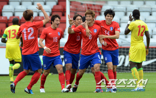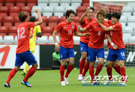 2012 런던올림픽 축구 대표팀의 기성용이 20일(현지시간) 런던 인근 스티브니지 라멕스 스타디움에서 열린 세네갈과의 평가전에서 전반 팀의 첫골을 넣은 뒤 환호하고 있다.