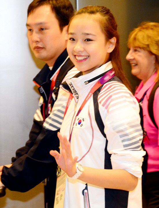 21일 오전(현지시각) 리듬체조 요정 손연재가 밝게 웃으며 런던 히스로 국제공항을 통해 입국하고 있다.20120721런던=올림픽사진공동취재단
