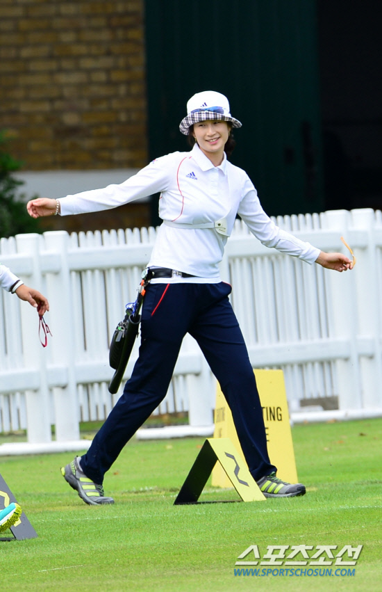 런던올림픽 양궁 국가대표 기보배 선수가 20일(현지시각) 런던 로즈 크리켓 그라운드에서 올림픽 개막을 앞두고 훈련을 하며 밝은 표정을 짓고 있다.