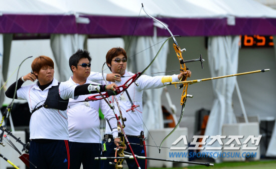 런던올림픽 양궁 남자국가대표로 출전한 김법민,오진혁,임동현 선수(사진 왼쪽부터)가 20일(현지시각) 런던 로즈 크리켓 그라운드에서 올림픽 개막을 앞두고 연습을 하고 있다.