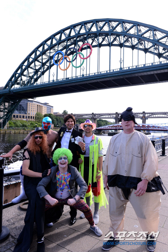 프로레슬러로 분장한 영국 뉴캐슬 시민들이 21일(현지시간) 오륜마크로 디자인된 타인브리지를 배경으로 포즈를 취하며 올림픽 분위기를 한껏 고조시키고 있다.