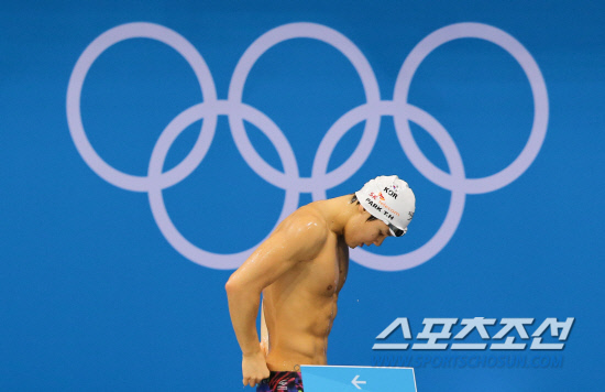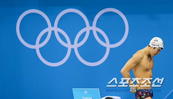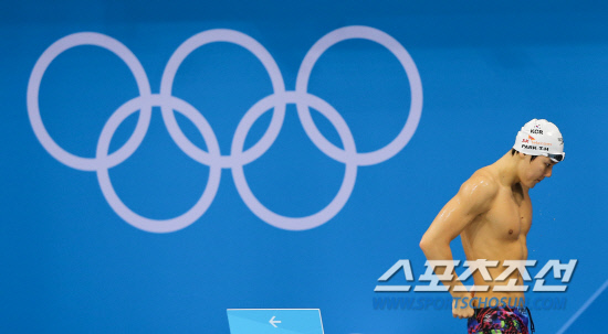 수영 남자 자유형 400m 금메달 2연패에 도전하는 박태환이 22일 오전(현지시각) 런던 올림픽파크 아쿠아틱 센터에서 훈련 도중 출발 연습을 하러 이동하며 오륜마크 앞을 지나고 있다. 20120722런던=올림픽사진공동취재단h