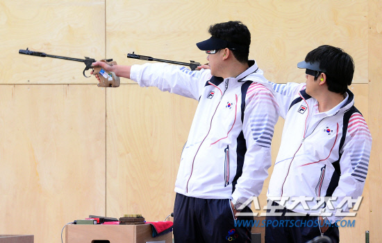 사격 진종오(왼쪽) 선수가 22일 오전 로얄아틸러리배럭(The Royal Artillery Barracks)에서 열린 대표팀 훈련에서 과녁을 겨누고 있다. 20120722. 런던=올림픽사진공동취재단e