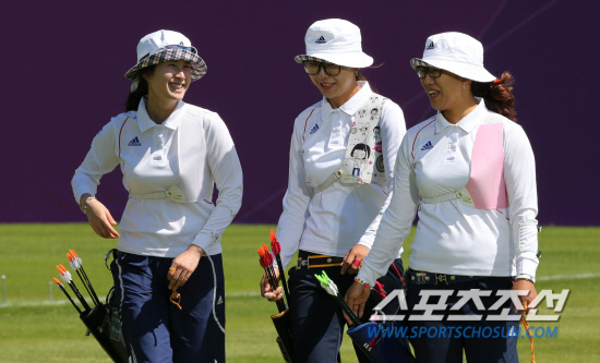런던 올림픽 양궁경기가 열리는 런던 로드스 크리켓 그라운드에서 22일 여자양궁 기보배,최현주, 이성진 선수가 과녘을 확인하고 난 뒤 웃으며 사로로 향하고 있다. 20120722. 런던=올림픽 사진공동 취재단b