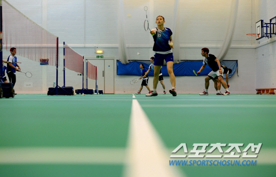 22일 배드민턴 국가대표 선수들이 런던올림픽 훈련 캠프가 차려진 브루넬대학 근처 실내연습장에서 훈련을 가졌다. 남녀 대표팀 선수들이 런던올림픽 메달을 향해 막바지 비지땀을 흘리고 있다.