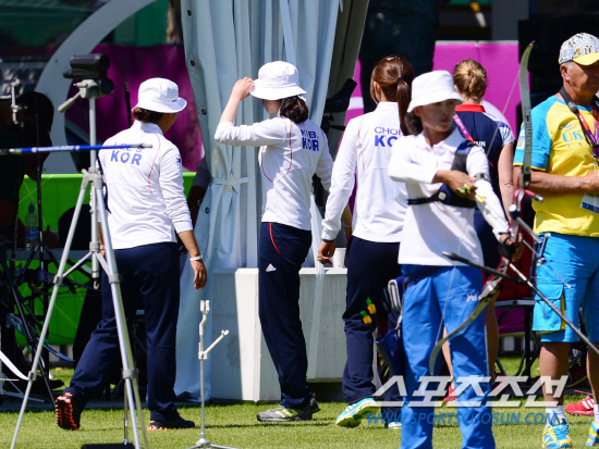 23일 런던올림픽 양궁 연습이 열린 런던 로즈크리켓 그라운드에서 북한의 권은실이 활을 당기는 가운데 연습을 마친 대한민국 선수들이 자리를 뜨고 있다. 20120723런던=올림픽사진공동취재단e