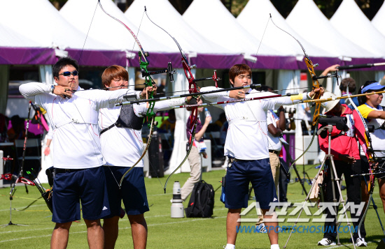 [남자 양궁대표 든든한 삼형제]런던올림픽 양궁 남자국가대표 오진혁(왼쪽부터) 김법민, 임동현이 23일(현지시각) 런던 로즈크리켓 그라운드에서 연습도중 동시에 시위를 당기고 있다. 20120723런던=올림픽사진공동취재단e