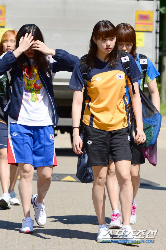 23일 런던올림픽 훈련 캠프가 차려진 브루넬대학에서 국가대표 선수들이 훈련을 가졌다. 수영 대표팀 선수들이 오전 훈련을 마치고 숙소로 향하고 있다. 정다래(오른쪽 두 번째)가 동료들과 함께 들어오고 있다.