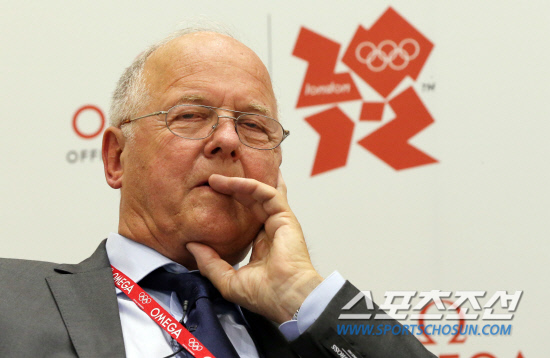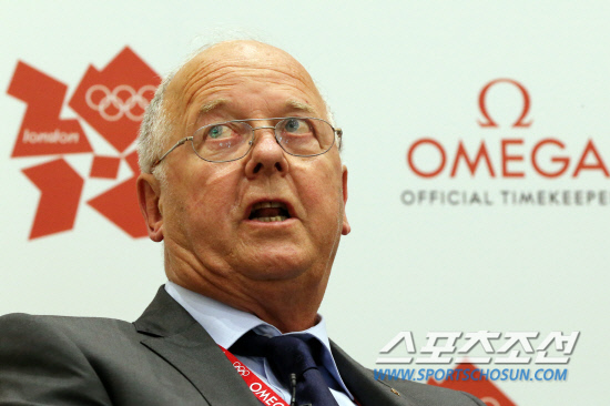 피터 헤츨러 오메가 타임 키핑 보드 멤버가 올림픽 개막을 나흘 앞둔 23일 런던 스트라트포드 오메가 부티크에서 열린 오메가 타임키핑 공식 런칭 행사에 나와 기자들의 질문에 답하고 있다.20120723. 런던=올림픽사진공동취재단b