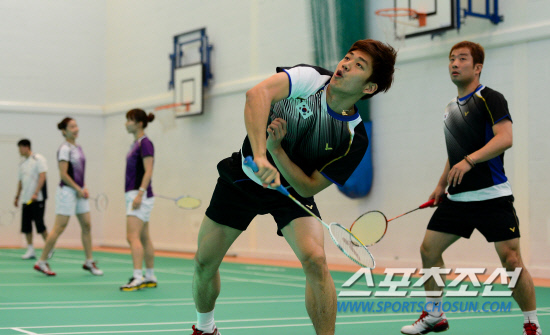 23일 런던올림픽 훈련 캠프가 차려진 브루넬대학에서 국가대표 선수들이 훈련을 가졌다. 배드민턴 대표팀이 브루넬대학 근처 실내 연습장에서 훈련을 했다. 남자복식에 출전하는 이용대-정재성 조가 동료들과 함께 훈련에 임하고 있다. 셔틀콕을 넘기고 있는 이용대.