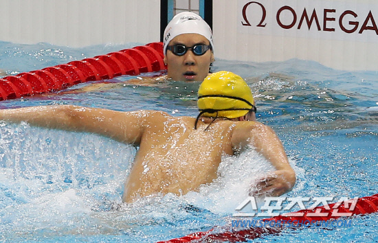 수영 금메달 2연패에 도전하는 박태환이 24일 오전(현지시각) 런던 올림픽파크 아쿠아틱 센터에서 훈련을 하던중 다른 나라 선수의 영법을 지켜보고 있다. 20120724 런던=올림픽사진공동취재단m