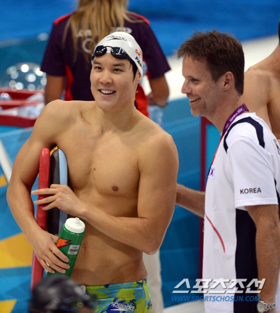 24일 오전(현지시간) 수영 남자 자유형 400m 금메달 2연패에 도전하는 박태환 선수가 2런던 올림픽파크 아쿠아틱 센터에서 훈련을 마치고 던컨 코치와 밝게 웃으며 경기장을 나서고 있다.20120724런던=올림픽사진공동취재단l