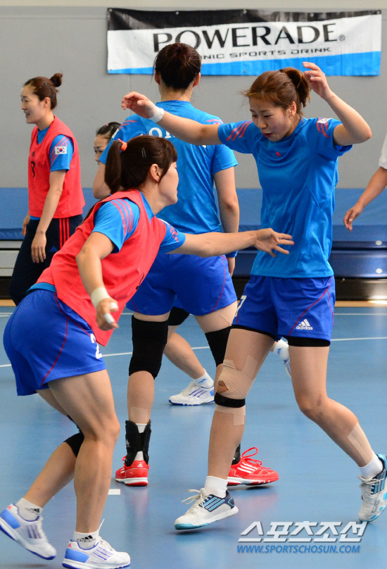 여자핸드볼 국가대표 선수들이 24일 오후(현지시간) 런던 서쪽 브루넬대학 훈련캠프에서 게임을 하며 몸을 풀고 있다. 20120724런던=올림픽사진공동취재단f