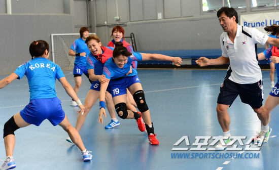 여자핸드볼 국가대표 선수들이 24일 오후(현지시간) 런던 서쪽 브루넬대학 훈련캠프에서 게임을 하며 몸을 풀고 있다. 20120724런던=올림픽사진공동취재단f