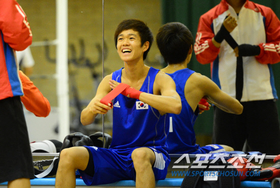 복싱 국가대표 신종훈이 24일 오후(현지시간) 런던 서쪽 브루넬대학 훈련캠프에서 훈련을 하며 환하게 웃고 있다