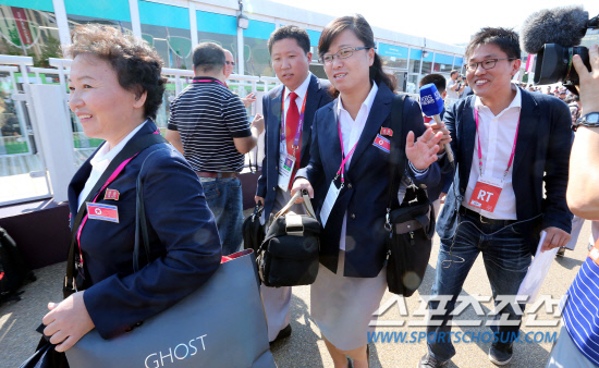 [런던포토] 선수촌 입촌한 북한 선수단, '듣고 싶은 말들이 많은데...'