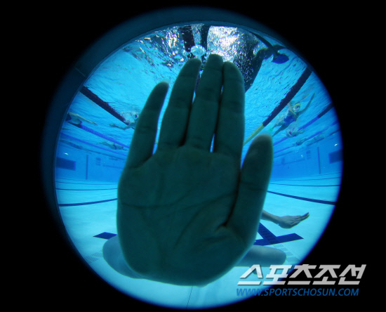 올림픽 개막을 이틀 앞둔 25일 런던 올림픽파크 아쿠아틱센터에서 각국 선수들이 훈련에 열중하고 있는 가운데 물밑에 설치된 사진취재 장소를 발견한 한 선수가 장난스럽게 손으로 유리를 가리고 있다.