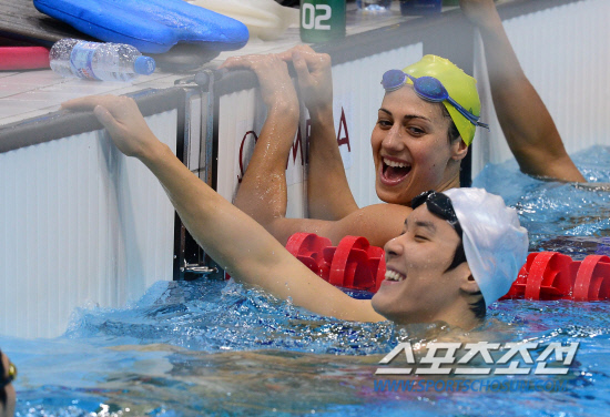 올림픽 개막을 이틀 앞둔 25일 박태환이 런던 올림픽파크 아쿠아틱센터에서 훈련하던 도중 각국 선수들과 대화하며 밝은 표정을 짓고 있다. 120725. 런던=올림픽사진공동취재단e