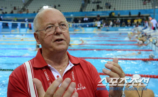 피터 헤츨러 오메가 타임 키핑 보드 멤버가 올림픽 개막을 앞둔 25일 런던 올림픽 수영 경기가 열리는 아쿠아스틱에서 오메가 기술에 대해 설명하고 있다.