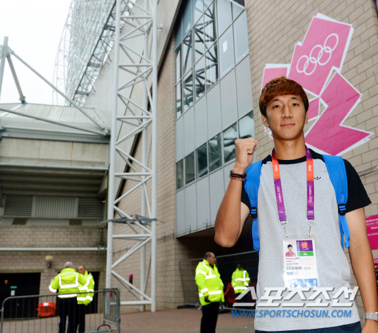 2012 런던올림픽 축구대표팀에서 부상으로 낙마한 한국영을 대신해 발탁된 정우영(23·교토상가)이 25일(현지시간) 오후 뉴캐슬에 입성해 경기가 벌어질 세인트 제임스 스타디움에서 아이디를 발급받은 뒤 포즈를 취하고 있다.