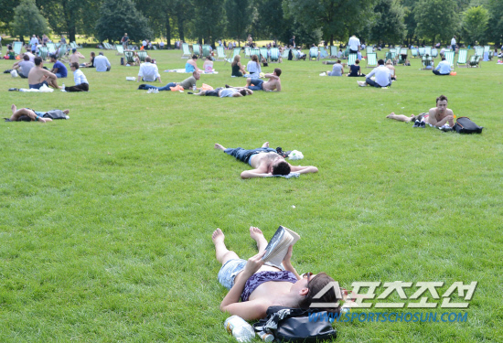 런던올림픽이 다가온 가운데 날씨가 화창하자 영국 시민들이 공원에서 일광욕을 즐기고있다(런던그린파크)