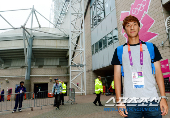 2012 런던올림픽 축구대표팀에서 부상으로 낙마한 한국영을 대신해 발탁된 정우영(23·교토상가)이 25일(현지시간) 오후 뉴캐슬에 입성해 경기가 벌어질 세인트 제임스 스타디움에서 아이디를 발급받은 뒤 포즈를 취하고 있다.