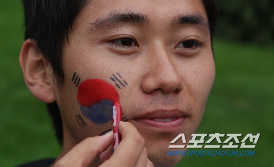 런던올림픽 개막을 하루 앞둔 26일 오후(현지시각) 뉴캐슬 세인트 제임스 파크 경기장에서 열린 남자축구 비(B)조 대한민국-멕시코 경기를 앞두고 일찌감치 경기장을 찾은 한국인 유학생이 얼굴에 태극기를 그리며 경기 시작을 기다리고 있다.