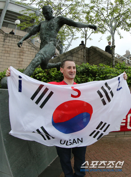 런던 올림픽 축구 남자B조 조별예선 대한민국 대 멕시코 경기가 열리는 26일 오후(현지시간) 영국 뉴캐슬 세인트 제임스 파크를 찾은 한 외국인이 태극기를 들고 응원하고 있다. 20120726 뉴캐슬=올림픽사진공동취재단m