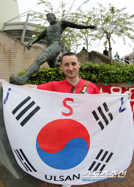 런던 올림픽 축구 남자B조 조별예선 대한민국 대 멕시코 경기가 열리는 26일 오후(현지시간) 영국 뉴캐슬 세인트 제임스 파크를 찾은 한 외국인이 태극기를 들고 응원하고 있다. 20120726 뉴캐슬=올림픽사진공동취재단m