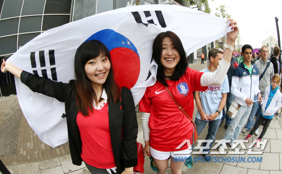 런던 올림픽 축구 남자B조 조별예선 대한민국 대 멕시코 경기가 열리는 26일 오후(현지시간) 영국 뉴캐슬 세인트 제임스 파크를 찾은 중국 유학생 naiyue Ma, yuning Han가 태극기를 들고 환호하고 있다. 20120726 뉴캐슬=올림픽사진공동취재단m
