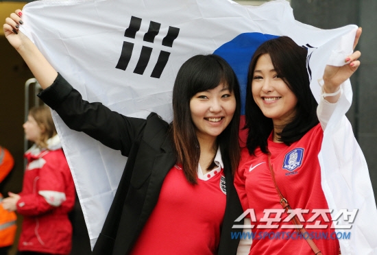 런던 올림픽 축구 남자B조 조별예선 대한민국 대 멕시코 경기가 열리는 26일 오후(현지시간) 영국 뉴캐슬 세인트 제임스 파크를 찾은 중국 유학생 naiyue Ma(오른쪽), yuning Han가 태극기를 들고 환호하고 있다. 20120726 뉴캐슬=올림픽사진공동취재단m