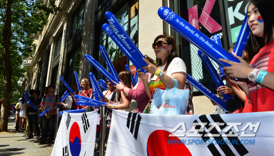 올림픽축구 8강 진출권을 놓고 맥시코와의 첫 대결이 벌어진 26일 오후(현지시간) 영국 런던 주영한국문화원앞 거리에서 교민과 유학생들이 길거리응원을 펼치고 있다.