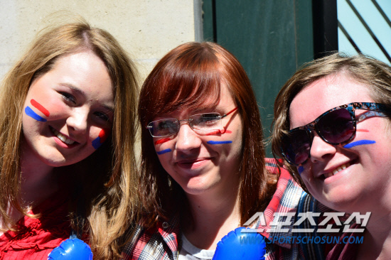 올림픽축구 8강 진출권을 놓고 맥시코와의 첫 대결이 벌어진 26일 오후(현지시간) 영국 런던 주영한국문화원앞 거리에서 런던 시민들이 대한민국 길거리응원전에 참여하고 있다.
