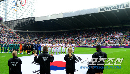 대한민국이 26일 오후 영국 뉴캐슬 세인트제임스파크 스타디움에서 멕시코를 상대로 런던올림픽 남자축구 B조 1차전을 펼쳤다. 첫 경기를 갖고 있는 대한민국 선수들.