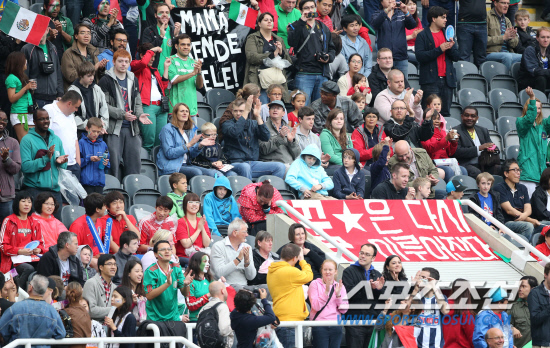 런던올림픽 개막을 하루 앞둔 26일 오후(현지시각) 뉴캐슬 세인트 제임스 파크 경기장에서 열린 남자축구 비(B)조 1차전 대한민국과 멕시코 경기에서 한국 응원단이 선수들에게 박수를 보내고 있다.
