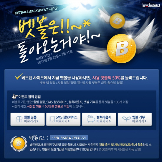 국민체육진흥공단(www.kspo.or.kr)이 발행하는 체육진흥투표권 수탁사업자인 스포츠토토의 공식 온라인 사이트 베트맨(betman.co.kr)이 사용벳볼의 50%를 베트맨 회원들에게 돌려드리는 '벳볼은 돌아오는거야!' 이벤트를 실시한다.