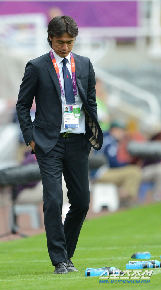 2012 런던올림픽 축구대표팀의 홍명보 감독이 26일(현지시간) 뉴캐슬의 세인트 제임스 파크 스타디움에서 열린 멕시코전에서 전반 무승부로 골이 터지지 않자 고심하는 듯한 모습을 보이고 있다.