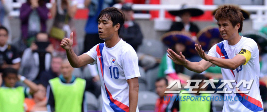올림픽 축구대표팀 박주영과 구자철이 26일(현지시간) 영국 뉴캐슬 세인트 제임스 파크 경기장에서 열린 멕시코와의 경기에서 프리킥 찰 준비를 하고 있다.
