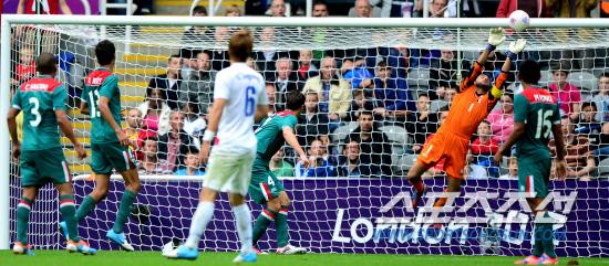 대한민국이 26일 오후 영국 뉴캐슬 세인트제임스파크 스타디움에서 멕시코를 상대로 런던올림픽 남자축구 B조 1차전을 펼쳤다. 후반 기성용의 중거리 슈팅이 멕시코 골키퍼의 호수비에 막히고 있다.