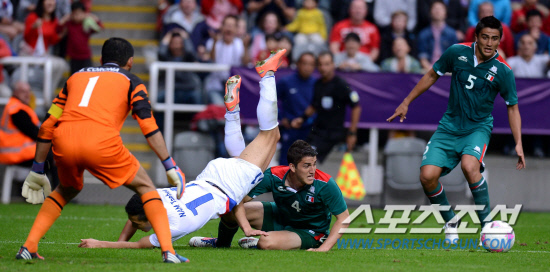 올림픽 축구대표팀 남태희가 26일(현지시간) 영국 뉴캐슬 세인트 제임스 파크 경기장에서 열린 멕시코와의 경기에서 멕시코 수비수에 걸려 넘어지고 있다.