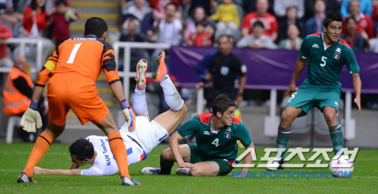 올림픽 축구대표팀 남태희가 26일(현지시간) 영국 뉴캐슬 세인트 제임스 파크 경기장에서 열린 멕시코와의 경기에서 멕시코 수비수에 걸려 넘어지고 있다.