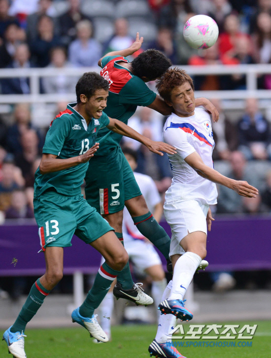 올림픽 축구대표팀 구자철이 26일(현지시간) 영국 뉴캐슬 세인트 제임스 파크 경기장에서 열린 멕시코와의 경기에서 멕시코 수비수들과 공중볼을 다투고 있다.