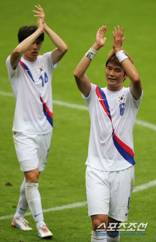 런던올림픽 개막을 하루 앞둔 26일 오후(현지시각) 뉴캐슬 세인트 제임스 파크 경기장에서 열린 남자축구 비(B)조 1차전 대한민국과 멕시코 경기가 무승부로 끝난 뒤 기성용(오른쪽)과 김창수가 응원해준 관중에게 박수로 답하고 있다.